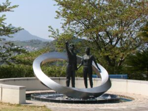 「愛・二人」祈念碑と名付けられ、男女の像を包む輪は、永遠の平和をイメージした「メビウスの輪」を表しています。